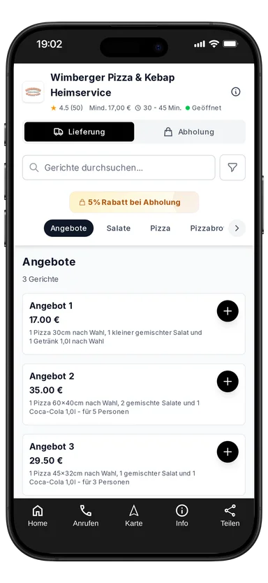 1 Pizza 30cm nach Wahl, 1 kleiner gemischter Salat und 1 Getränk 1,0l nach Wahl